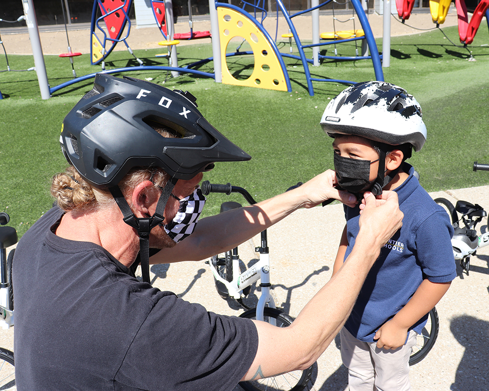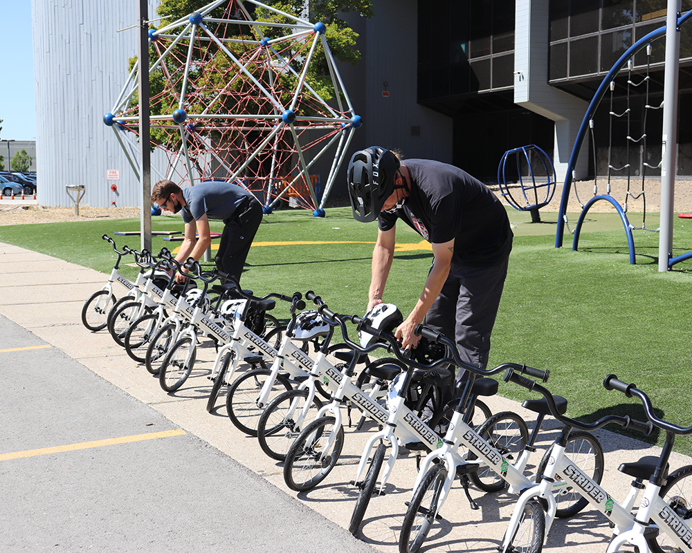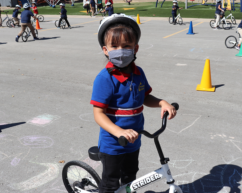 On September 23, 2021, many Kindergarten students at Frontier School of Innovation Elementary got on a bicycle for the very first time. Eric Sharp, FSI Elementary Interventionist, and avid bike rider himself, recognized the need for a complete Kindergarten PE Program, including a fleet of 24 Strider AKB-Specific Bikes, helmets, pedal conversion kits, one Strider 20 Bike for teacher instruction, and curriculum. With the support of All Kids Bike and many months of securing donations, Mr. Sharp finally received enough donations to purchase the fleet and equipment. Last week Mr. Sharp, Mr. Brown (PE Teacher), and Michael H. (2nd grade student), spent the week assembling the bikes, Michael H. assembling most of them. During PE today, Kindergarten students spent time learning how to put on a helmet safely, sit on a bike, balance, and walk the bike while sitting. The excitement and fear in their eyes was exhilarating for all to see. Teachers and administrators were watching from the windows in their classrooms and offices with smiles from ear to ear.
