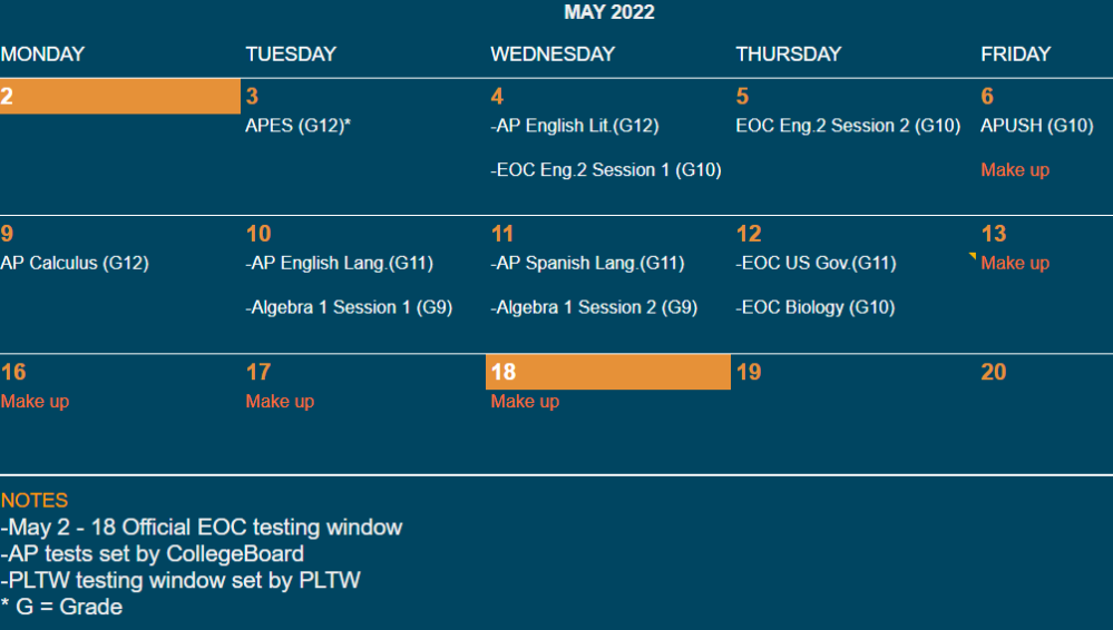 With the current school year winding down, students will be taking the Official state EOC tests and AP exams. It is critical to get familiar with the dates and prepare accordingly. For a successful outcome, we encourage our students to have a good night sleep, have good breakfast at home or at school, and know ahead of time the testing details that are comunicated to students. All non-testing students are asked to keep the noise level low during testing days and times. We appreciate the cooperation on this critical matter. Please see below the Official state EOC and AP Exam schedule.