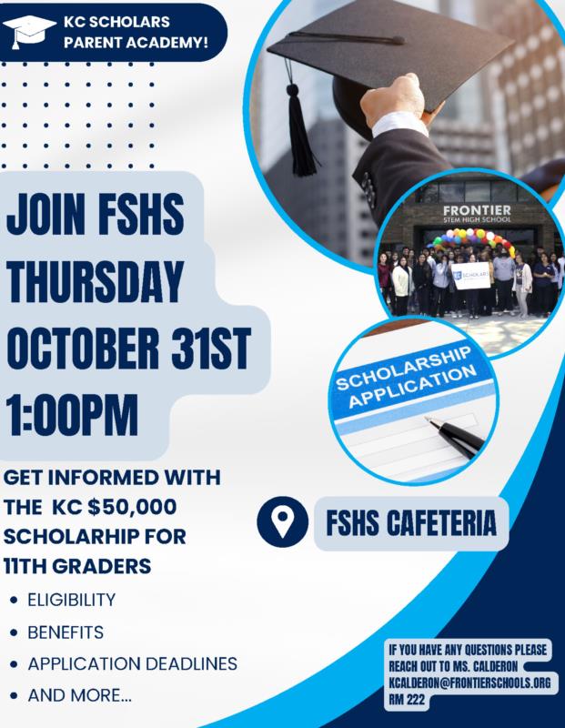 Hello Parents! We will be having a KC Scholars Parent Academy on Thursday, October 31st, at 1:00 PM in the FSHS Cafeteria. Join us to learn more about the $50,000 KC Scholarship for 11th Graders!