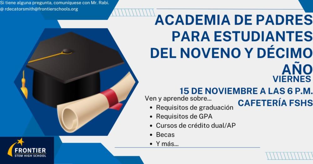 - Familia Panther, tendremos nuestra academia para padres de noveno y decimo grado el 15 de noviembre a las 6 pm! Repasaremos elementos importantes que son cruciales para el �xito de nuestros estudiantes! Se proporcionara la cena!