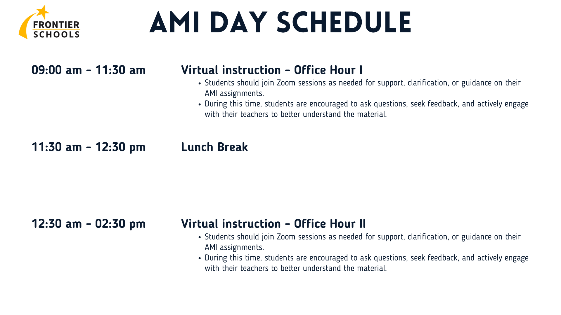 - On an AMI day, students will participate in remote learning from 9:00 a.m. to 2:30 p.m., with a break from 11:30 a.m. to 12:30 p.m.
